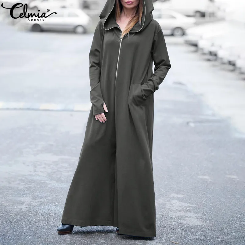 Женские винтажные комбинезоны Celmia 2020, модные повседневные свободные однотонные Комбинезоны на молнии с капюшоном и длинными рукавами, с ши...