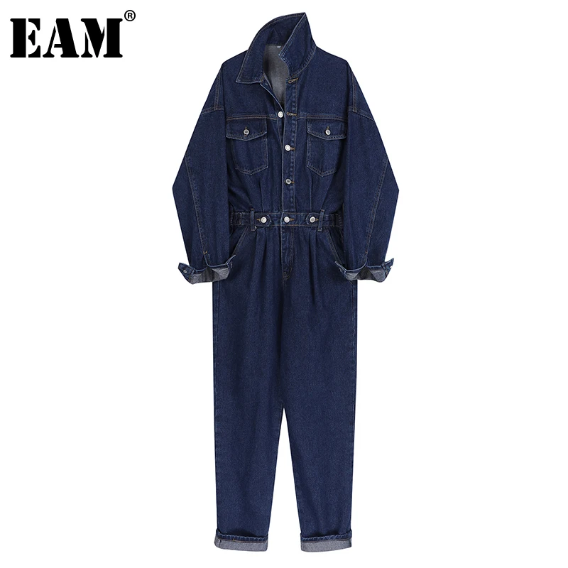 [EAM] свободный женский синий джинсовый комбинезон большого размера, новые брюки с высокой талией и карманами, модные весенне-осенние 2021 1DD7262
