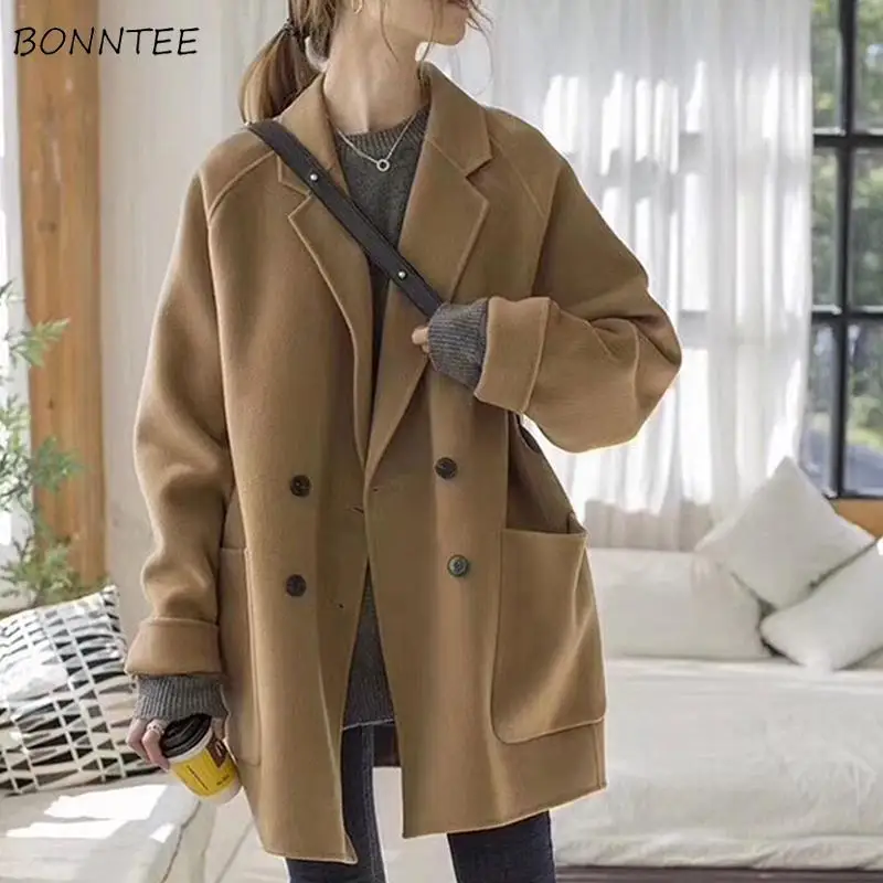 Женское повседневное шерстяное пальто, коричневое однотонное мешковатое пальто с длинным рукавом, простая элегантная эстетичная Женская о...