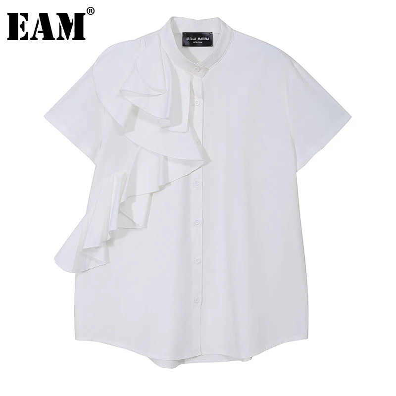 [EAM] Женская белая Асимметричная Блузка с оборками, новая свободная рубашка с отворотом и коротким рукавом, модная весенне-летняя 2021 1DD5930