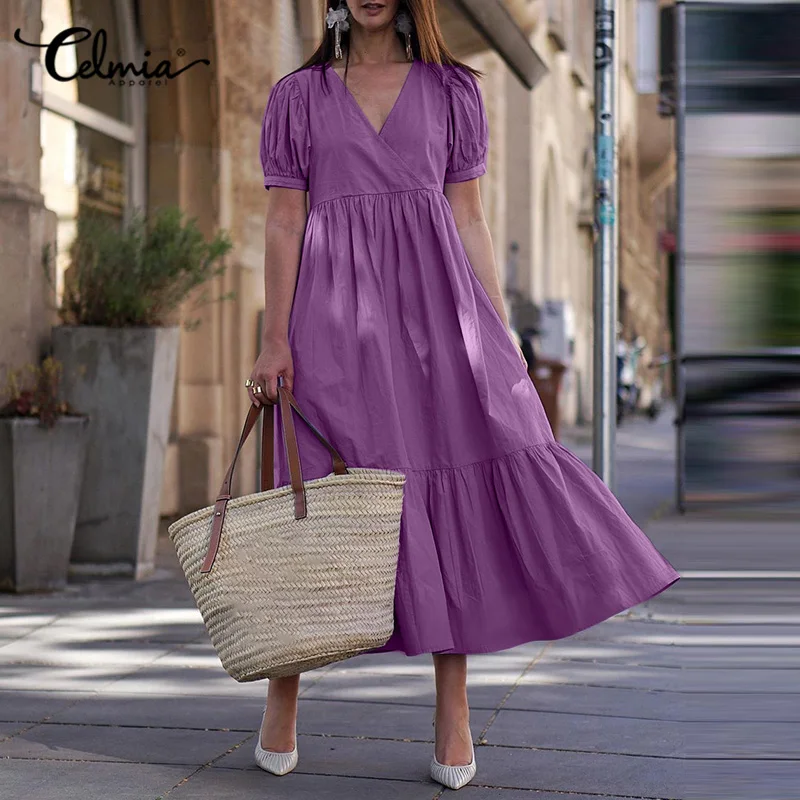 Богемное Женское Платье макси с оборками 2021 Celmia, летнее Пышное Платье с коротким рукавом и V-образным вырезом, праздничный Повседневный однотонный вечерние вечерний Сарафан