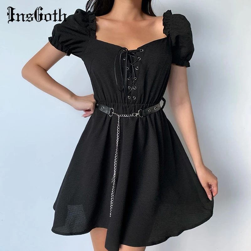 Женское мини-платье с пышными рукавами InsGoth, черное винтажное платье в стиле Харадзюку, с v-образным вырезом, в готическом стиле
