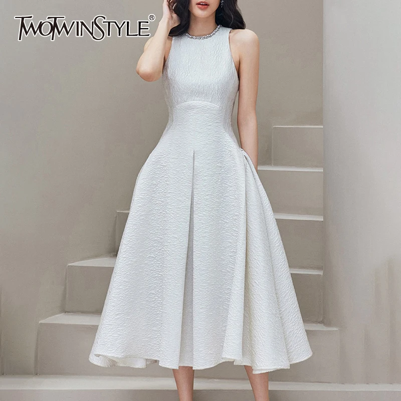 Twotwin2 Стиль Элегантные Лоскутные бриллианты для женщин с круглым вырезом без рукавов с высокой талией а линия тонкие миди платья женские летние 2021 стиль