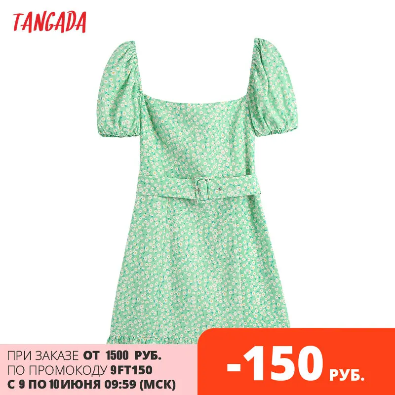 Tangada 2021 Лето женское зеленое с цветочным принтом французский Стиль платье с поясом, пышное платье с коротким рукавом, женская одежда, Vestidos, BE747