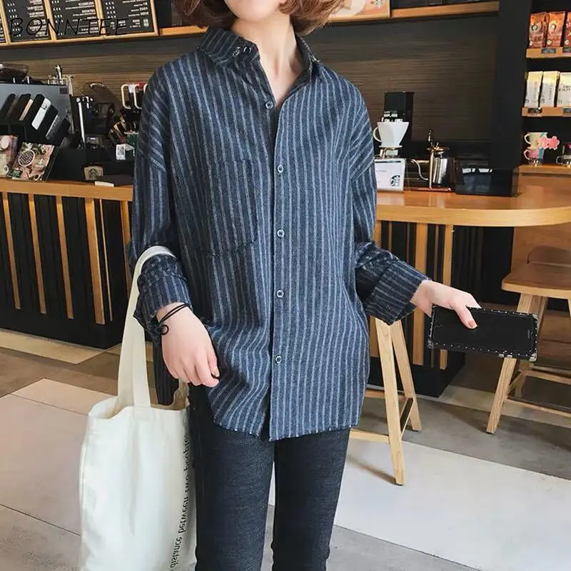 Женские рубашки в полоску в Корейском стиле, модные длинные блузки в стиле ретро, простые женские свободные Весенние рубашки высокого качества