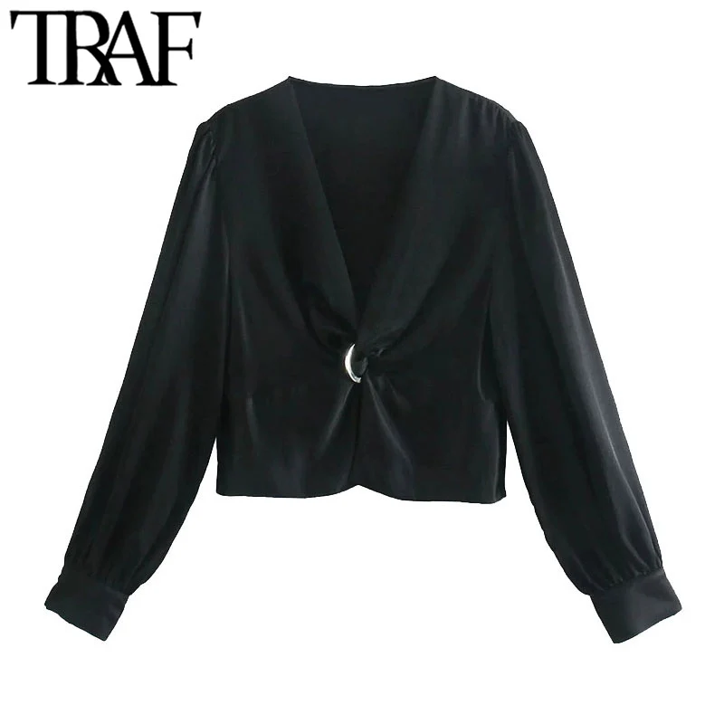TRAF Женская мода с бантом Удобные укороченные блузки в винтажном стиле; С v-вырезом и длинным рукавом, женские рубашки Blusas шикарные топы