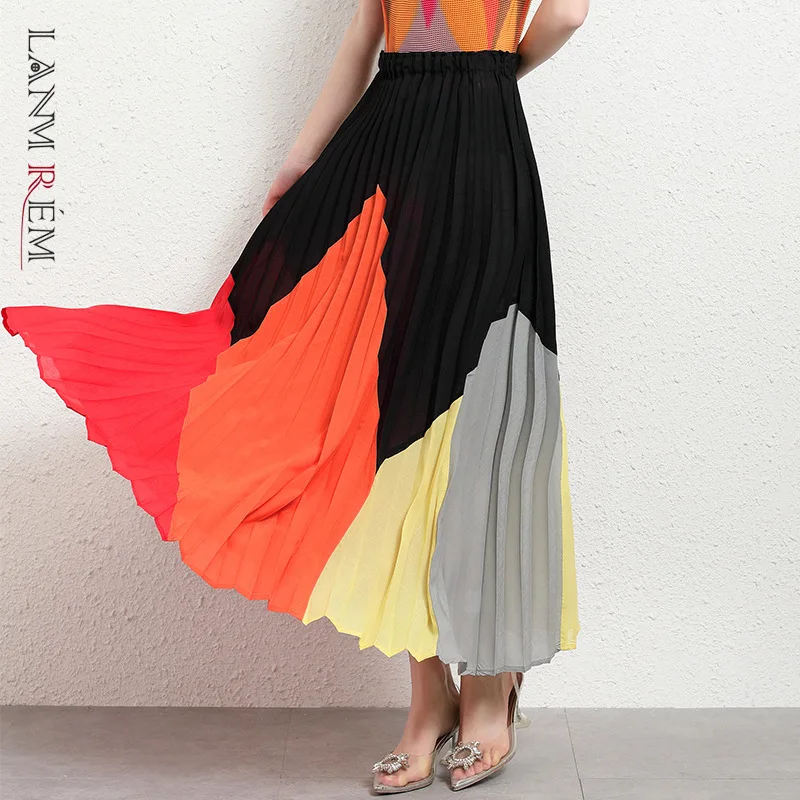 LANMREM 2021 летняя новая контрастная плиссированная юбка с большим подолом, с высокой эластичной талией, женская повседневная юбка средней длины YK171