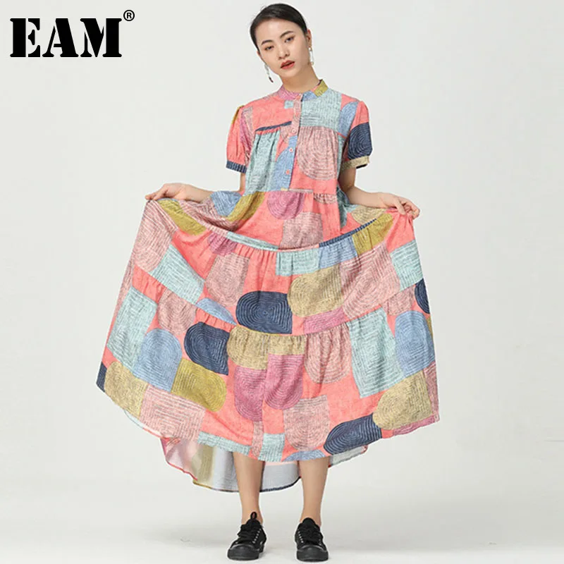 Женское плиссированное платье [EAM], плиссированное платье большого размера с воротником-стойкой, коротким пышным рукавом, свободного покроя, весна-лето 2021, 1DD7358