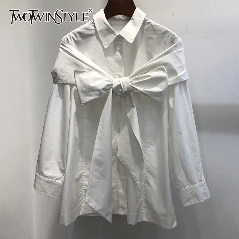 TWOTWINSTYLE Лоскутная Корейская рубашка с бантом для женщин, повседневная однотонная блузка с длинным рукавом, женская модная новая одежда 2021