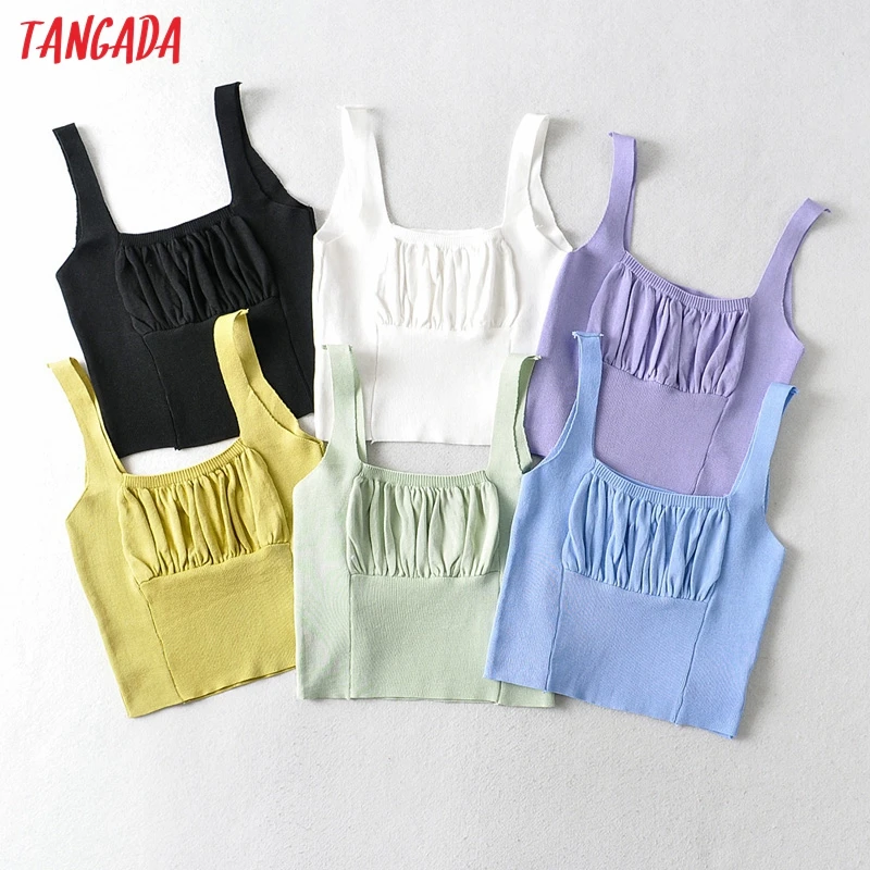 Tangada женские Карамельный цвет плиссированные трикотажные майки укороченный топ на бретелях без рукавов с открытой спиной и коротким рукавом Блузки Рубашки женские топы AI65