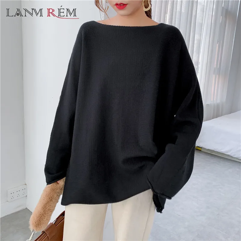 LANMREM Корейская одежда, свободный сексуальный вязаный свитер с вырезом лодочкой для женщин, большой размер, теплый осенне-зимний пуловер, топ...
