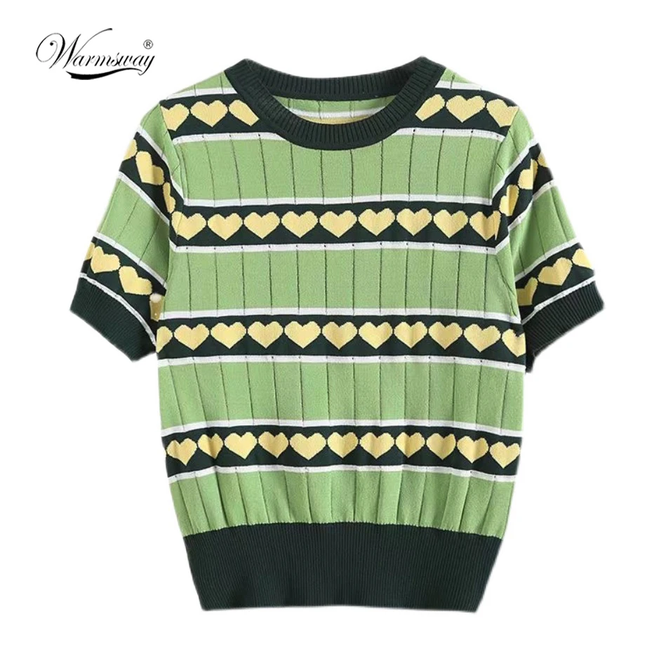 Летние зеленые свитера с коротким рукавом авокадо для женщин, винтажный Вязаный топ с узором в виде сердца, Укороченный трикотажный женский джемпер B-121