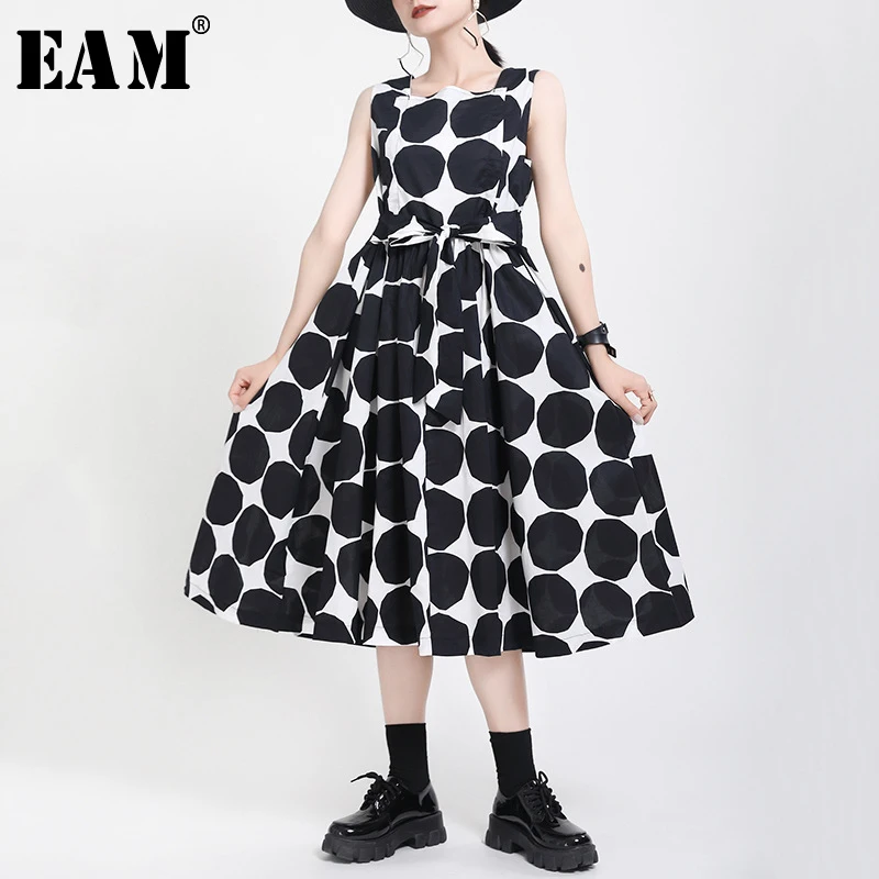 Женское платье средней длины с круглым вырезом EAM, черное свободное платье в горошек, весна-лето 2020, 1X351