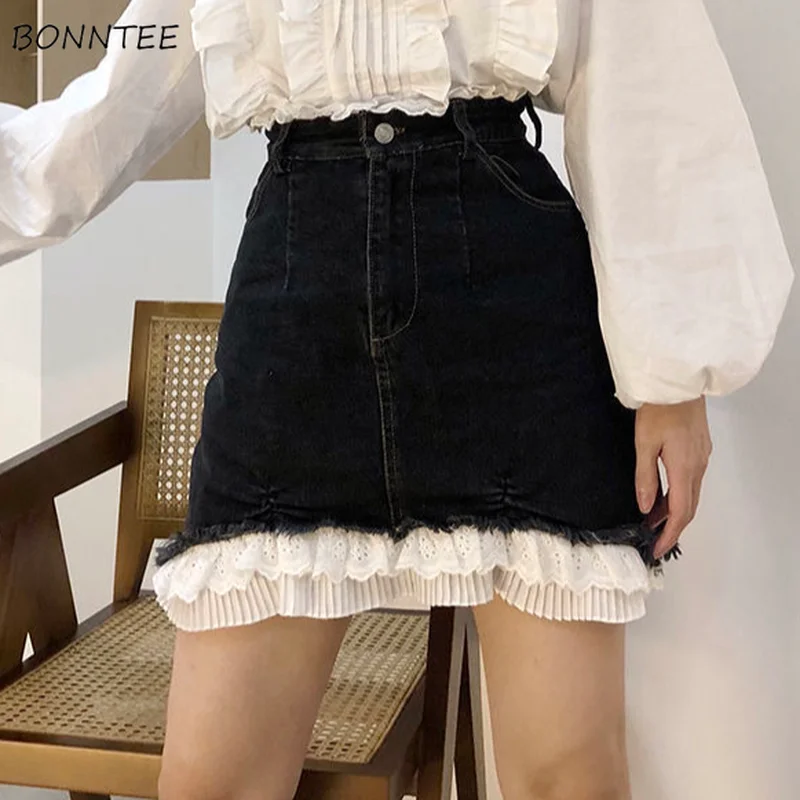 Skirts Women Lace Patchwork Above Knee Chic High Waist Student All-match Spring Ulzzang Stylish Leisure Elegant Feminino Denim
