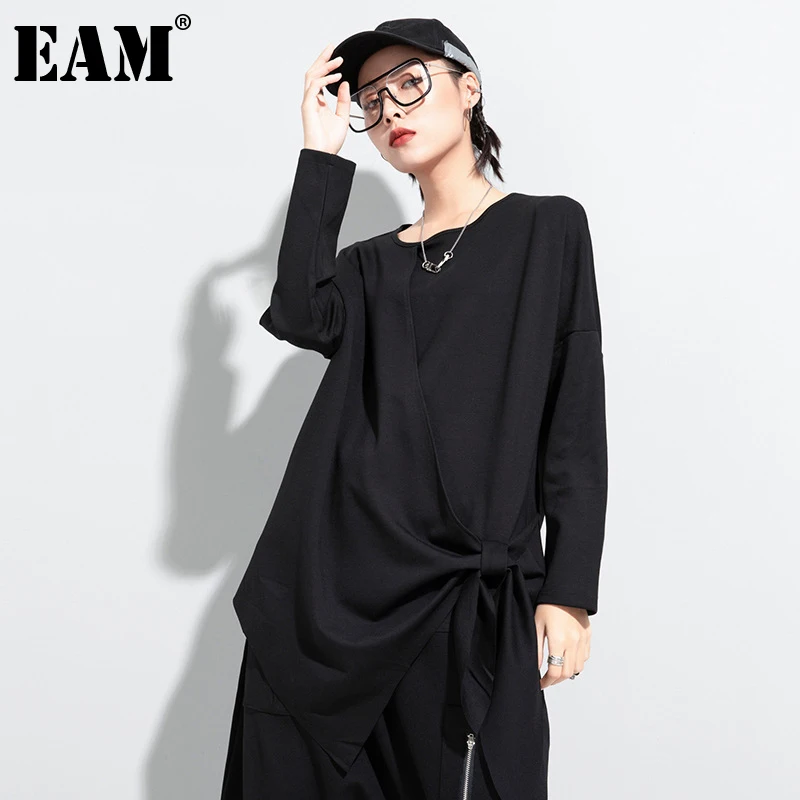 [EAM] Женская Черная Асимметричная футболка с бантиком большого размера, новая модная футболка с круглым вырезом и длинными рукавами, весна-о...
