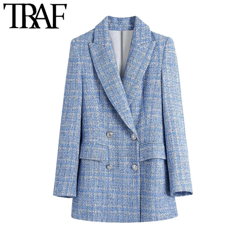 TRAF Женская мода двубортный Твид пиджаки пальто в винтажном стиле, с длинным рукавом и карманами, женская верхняя одежда, шикарная Veste