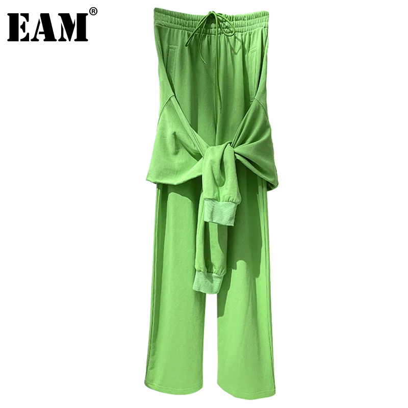 [EAM] зеленые широкие брюки с высокой эластичной резинкой на талии, новые свободные брюки для женщин, модные весенне-летние 2021 1DD97680