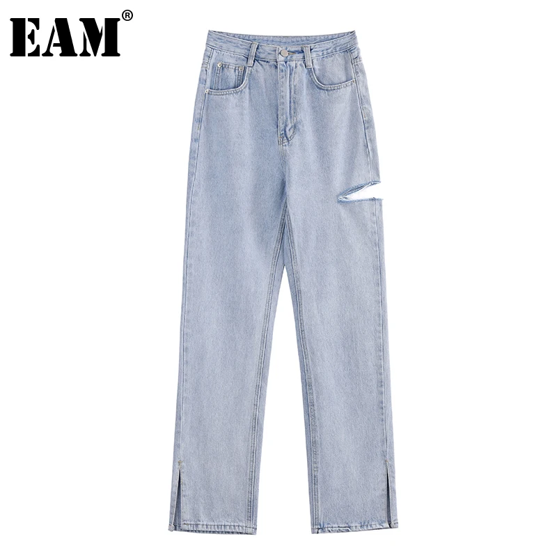 [EAM] длинные синие джинсовые рваные джинсы с высокой талией новые свободные женские брюки Мода весна осень 2021 1DD7862