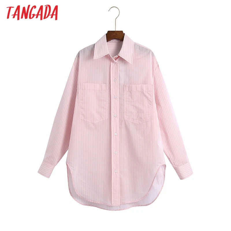 Tangada Для женщин розовый Полосатые Рубашки детские рубашки с длинными рукавами и отложным воротником, в элегантном офисном стиле женские Повседневная обувь блузки 6Z70