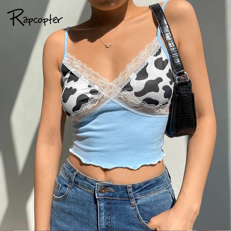 Rapcopter корова штамп поощрительные майки кружева лоскутное Y2K укороченный топ с оборками топ на бретелях без рукавов с открытой спиной сексуальный топ на бретелях, Для женщин вечерние клубная одежда