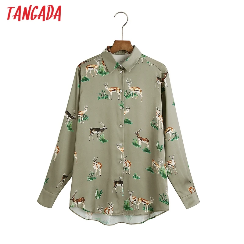 Tangada Для женщин больших размеров с животным принтом атласное платье-рубашка с длинным рукавом Корейская Повседневная Женская Повседневное Свободная рубашка 6Z60