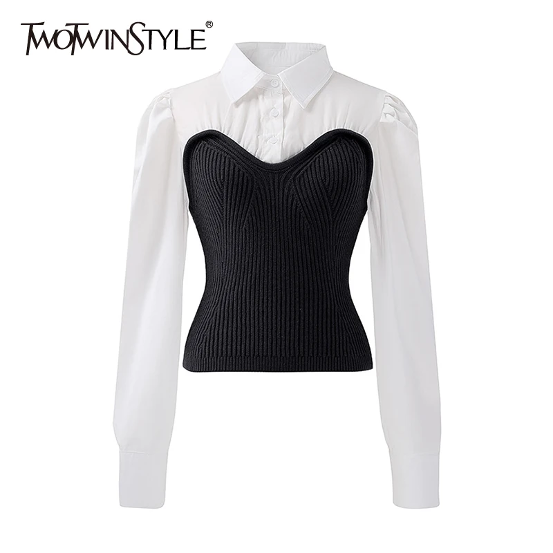 TWOTWINSTYLE, корейский стиль, лоскутные рубашки для женщин, с отворотом, с длинным рукавом, хитовый цвет, тонкие, имитация двух коротких топов, женская мода, новая одежда