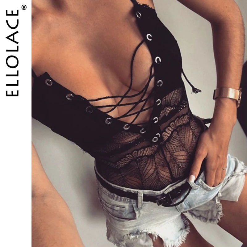 Ellolace Боди женские кружевные боди сексуальные комбинезоны На Шнуровке Для женщин прозрачный глубокий v-образный вырез женский боди Женский ...