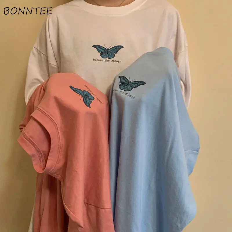 Футболки для женщин в виде бабочки женские туфли с принтом, летние футболки, женская верхняя одежда с О-образным вырезом удобные мешковатые кепки, кепки в стиле подростковые топы Базовая Kpop в консервативном стиле