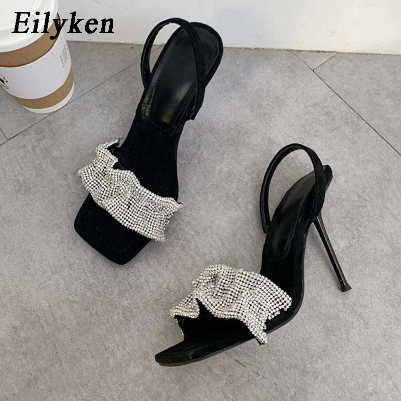 Eilyken/Новинка 2021 года; Летние модельные Серебристые сандалии; Женские сандалии с оборками на высоком каблуке; Пикантные вечерние женские сандалии с квадратным носком