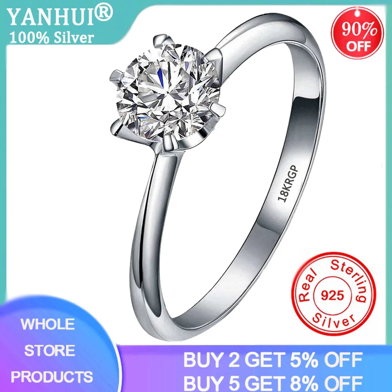 Женское кольцо с бриллиантами YANHUI, классическое кольцо из серебра 925 пробы, 18 К, белое золото, 1 карат, ювелирные украшения для свадьбы, вечеринки, годовщины
