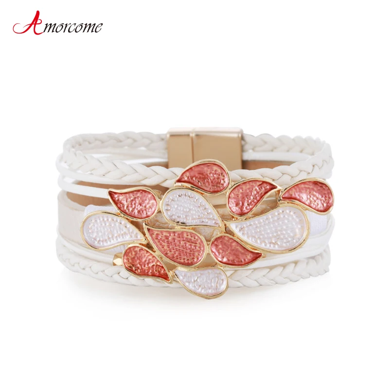 Amorcome Boho 2021 Новый эмалью в виде капли воды, браслеты с брелоками для женщин плетеный кожаный широкие браслеты на запястье Многослойные женские наручные ювелирные изделия