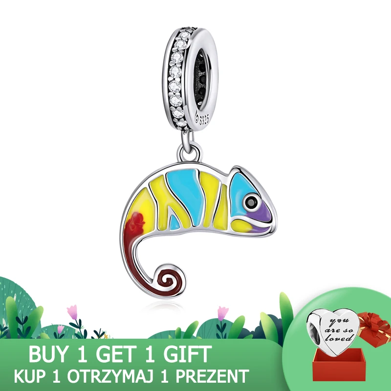 BISAER милый Хамелеон Подвески 925 пробы серебро фон с изображением разноцветного загадочного животных бусины браслет шарма ожерелья, сделай сам, ювелирное изделие EFC413