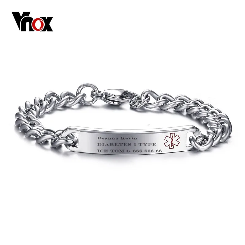 Vnox Бесплатная гравировка ледяной ID браслет для женщин мужчин цепь из нержавеющей стали тип 1 диабет медицинская аварийная бижутерия