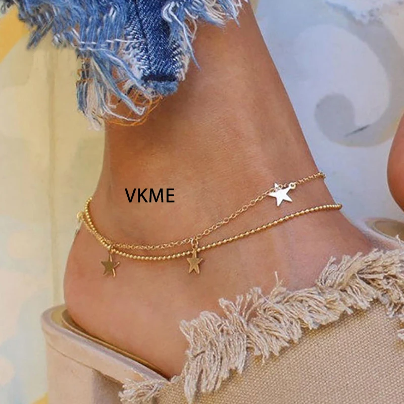 Браслет на щиколотку в стиле бохо Женский, многослойный ножной браслет с бусинами и звездами, босоножки, ювелирные изделия
