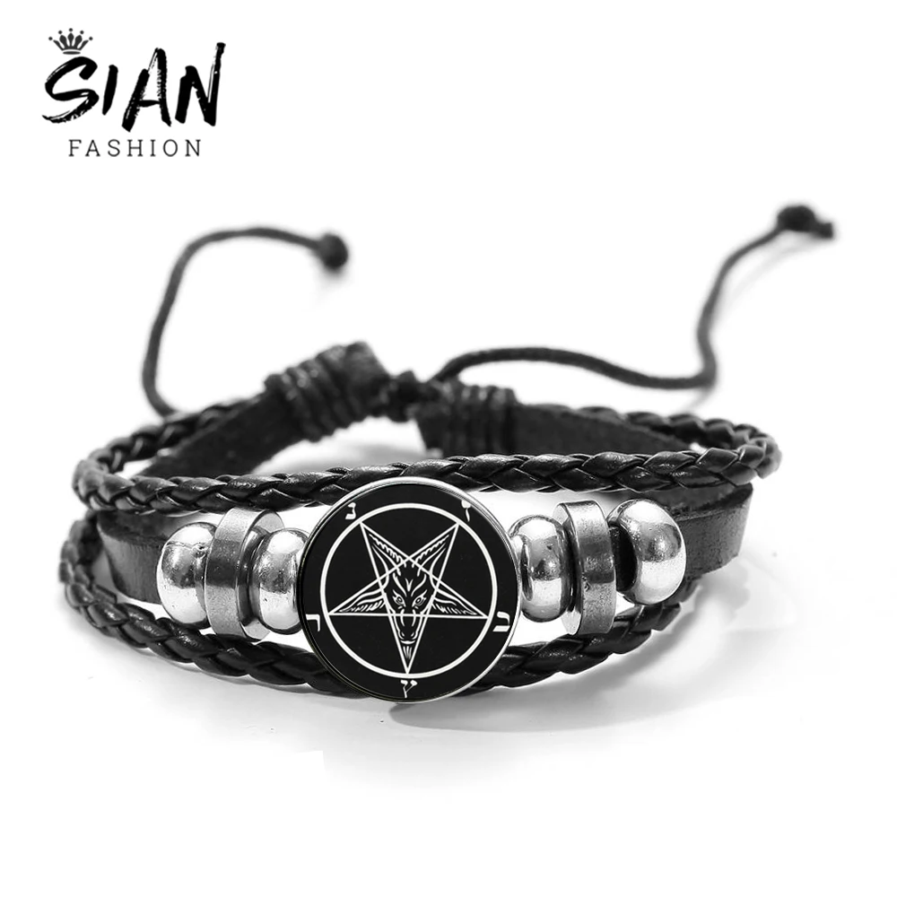 SIAN Black простой кожаный браслет с изображением головы козла сатанство с изображением перевернутой пентаграммы стеклянные куполообразные бусины плетеный браслет готический браслет