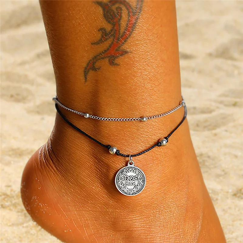 Модные Многослойные браслеты для женщин в стиле бохо с бусинами, винтажная портретная печать, Очаровательные кожаные браслеты на ногу, Пляжная цепочка, ювелирные изделия
