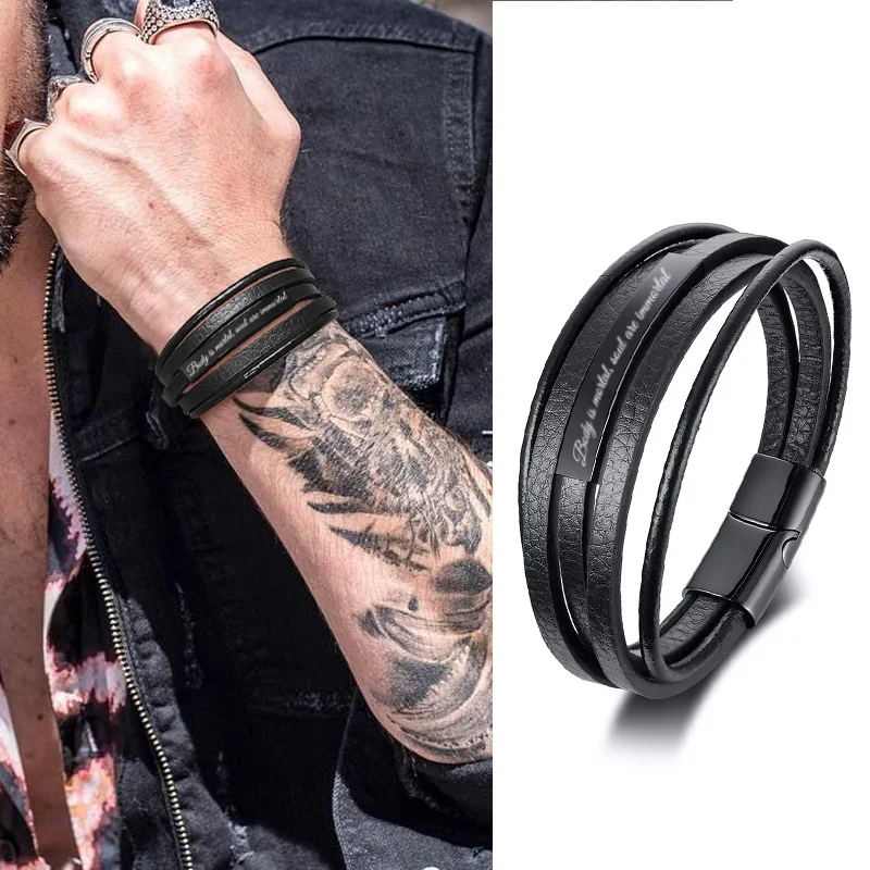 Мужской кожаный браслет, черный многослойный Плетеный браслет, мужские браслеты с гравировкой, мужские ювелирные изделия