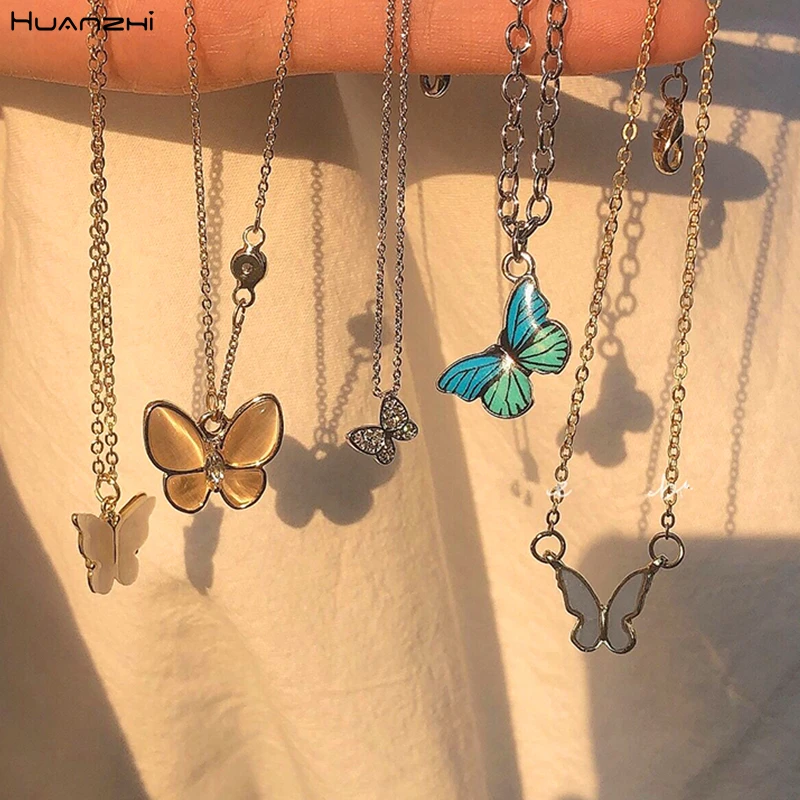 HUANZHI, Новинка лета 2020, подвеска в виде синей фиолетовой бабочки в Корейском стиле, простая модная цепочка до ключиц, ожерелье для женщин и дев...