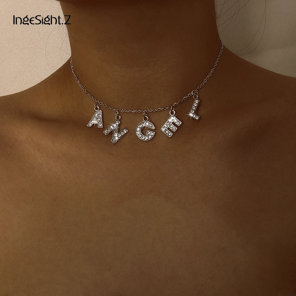 Женское колье-чокер в стиле панк IngeSight.Z, с блестящими кристаллами, с надписью «ANGEL», серебристые Стразы