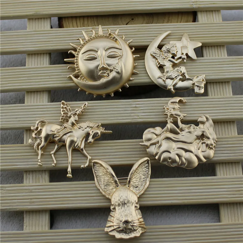 Винтажная пустотелая Геометрическая однотонная прямоугольная портретная египетская золотая металлическая брошь ангел Единорог Иисус луна кролик солнцезащитные булавки