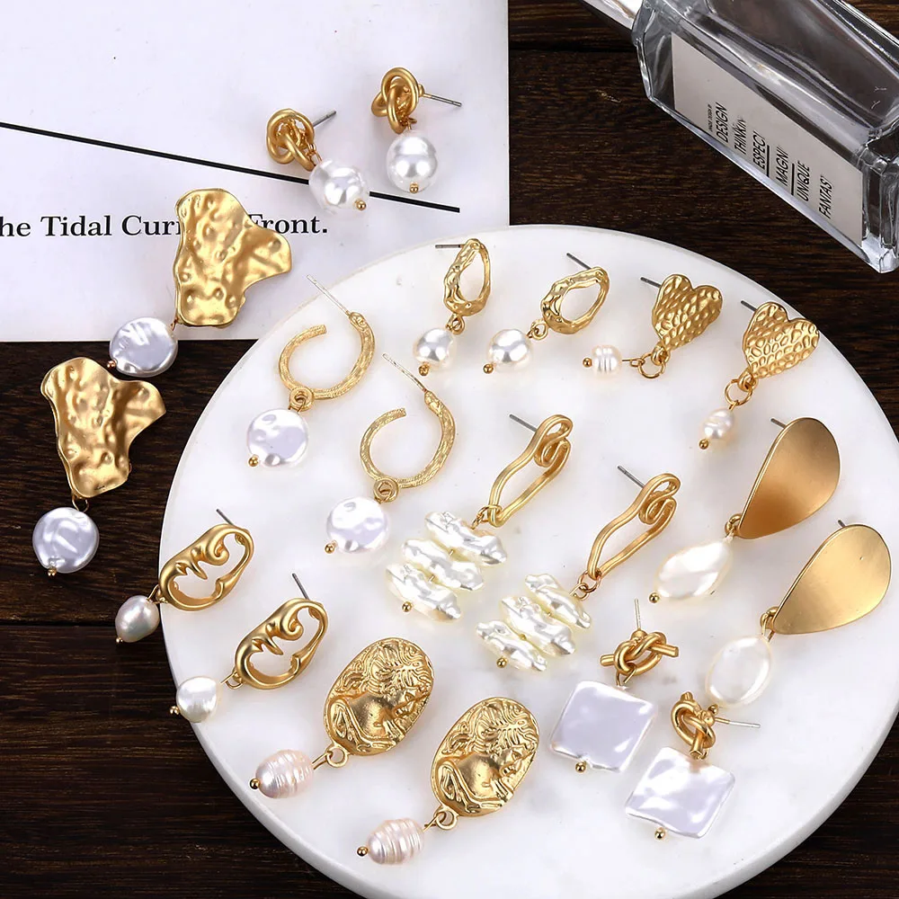 EN простые золотые серьги матовые металлические Человеческие Головы лицо тела пресноводные жемчужины неправильной формы серьги для женщин ...