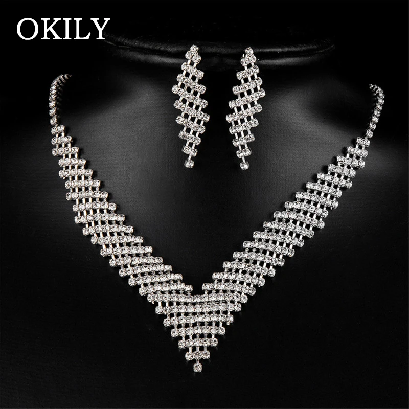 Роскошные хрустальные свадебные ожерелья серьги Ювелирные наборы для невесты ювелирные изделия Серебряная Геометрическая Серьга для женщ...