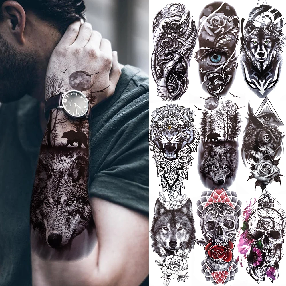 Тату-наклейка с черным лесом для мужчин и женщин, временная татуировка с тигром, волком, черепом смерти, хной, скелетом, королем, тату с живот...